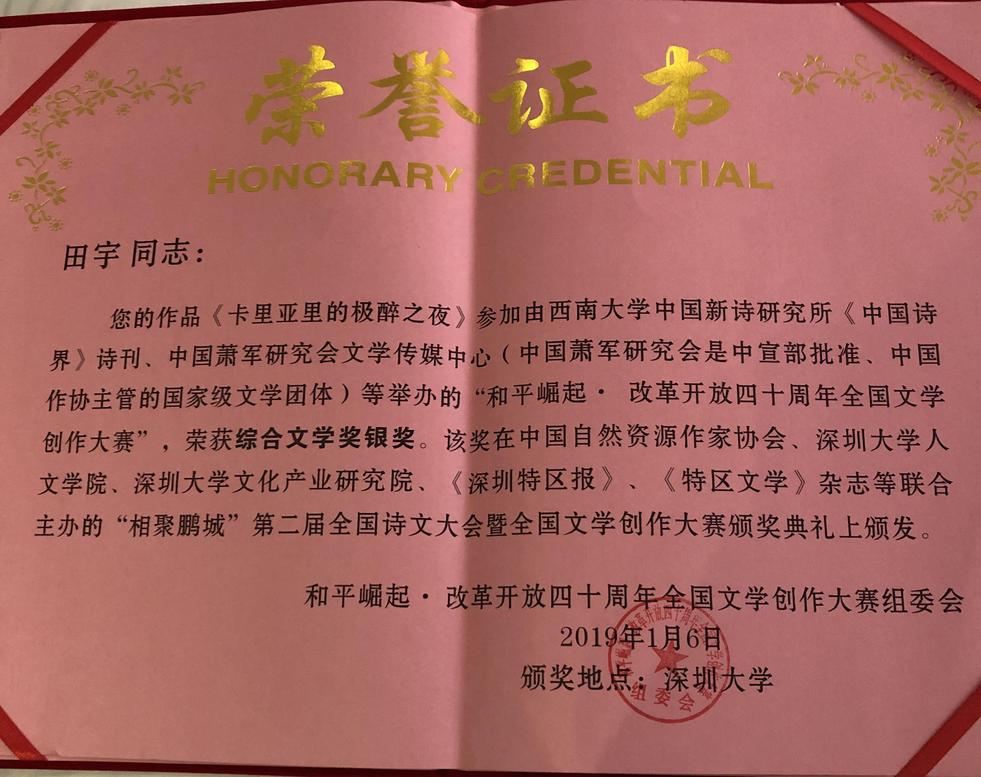 和平崛起·改革開放四十周年全國文學創(chuàng)作大賽綜合文學獎銀獎。