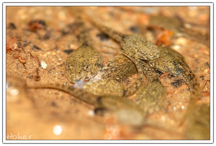 后,這些卵會(huì)自己黏在水底的植物上,直到蝌蚪破卵而出。日本溪樹蛙的蝌蚪一般呈淺灰色,身體呈橢圓形,尾巴幼而長,其長度達(dá)其身軀的兩倍以上,也有一些較深色的橫蚊。