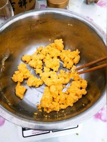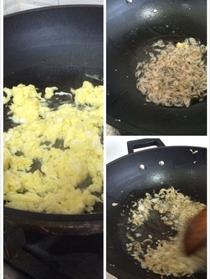 鍋里放油,把雞蛋炒出,滑散成碎塊,再次放油,炒干蝦米,炒到一半加入蒜末蔥碎,直到聞到蒜香味,蝦米有點(diǎn)變黃,出鍋加入到小白菜中