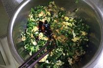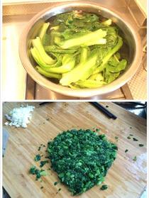 抄過(guò)水的小白菜過(guò)一下涼水,攥出多余水分,切碎,裝盆