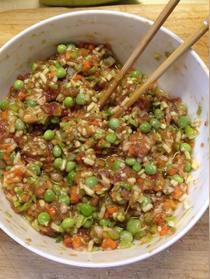 把肉和各種菜,調(diào)料混合在一起