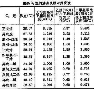 由石油煉制過程副產(chǎn)的C5餾分只含有烷烴和烯烴,由其中分離出一種或幾種C5烷烴或烯烴產(chǎn)品只需普通精餾或用硫酸吸收即可。烴類裂解制乙烯副產(chǎn)的C5餾分組成復(fù)雜,含有烷烴、烯烴、二烯烴和炔烴,它們的沸點(diǎn)相近,只差幾度甚至零點(diǎn)幾度,因此,相對(duì)揮發(fā)度也十分接近(見表),難以用普通精餾方法制取單一C5烴。對(duì)于主要分離對(duì)象異戊二烯而言,也有多種其他C5烴的沸點(diǎn)與其接近,用一般精餾方法制取高純度異戊二烯比較困難。
