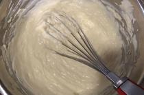 4.將步驟1里做好的巧克力黃油緩慢倒入步驟2的雞蛋里,邊倒邊用電動打蛋器攪拌。然后篩入面粉,攪拌均勻