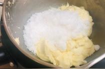 然后加入細砂糖,用電動打蛋器把奶酪和糖打至順滑;