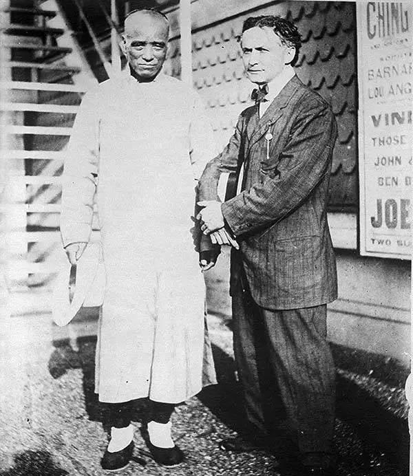 朱連魁有很多著名的魔術(shù),例如“口吐百丈”、“空竿釣魚”、“碎紙還原”等。[10]其中一個在美國引起轟動的節(jié)目是:用一塊空空如也的布,轉(zhuǎn)眼間便變出一只據(jù)說能裝80磅水的巨碗,水一直漫到碗沿上,再一探手,他又從水中拎出個小孩來。[1]“大碗飛水”是朱連魁最拿手的古彩戲法之一。右圖為美國魔術(shù)大師哈里·胡迪尼與朱連魁合影。