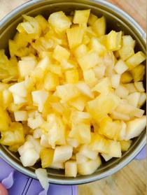 菠蘿切碎,如果喜歡顆粒感的可以用刀切粗點(diǎn)也沒(méi)事,如果喜歡細(xì)膩的可以切小后用榨汁機(jī)或破壁機(jī)榨一榨(不能加水榨)。 我用的是手動(dòng)攪碎器,可以完美控制出自己想要的顆粒程度