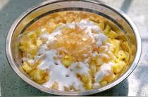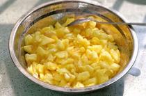 把菠蘿肉、冰糖(打碎)、白糖倒入盆中。