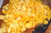 菠蘿去皮去芯,切成小果粒。