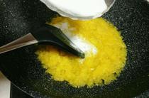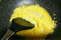 腌制好的菠蘿會(huì)出很多水,連水帶果肉,一起倒進(jìn)鍋里,小火翻炒