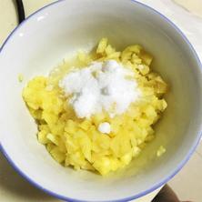 菠蘿或蘋果果肉切丁,放入白砂糖、鹽和檸檬汁。
