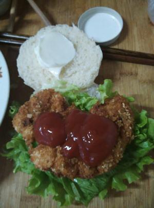 3.面包切片放入生菜、炸雞番茄沙司,沙拉醬。好啦!大功告成。[1]