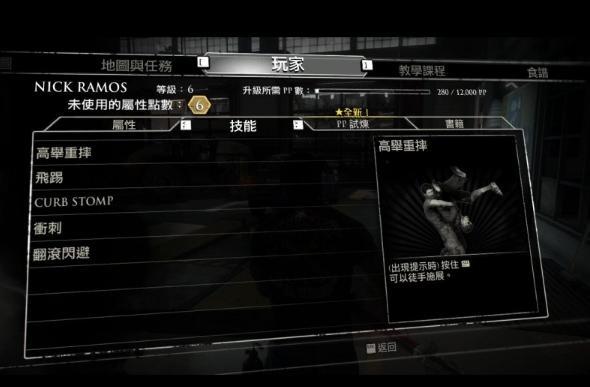 游戲中玩家會學(xué)習(xí)到一些技能,這些技能主要作用是近距離更強(qiáng)的攻擊喪尸,如抽取內(nèi)臟可以按住Y鍵+B鍵和下拉左搖桿,抽取喪尸的大腸;飛踹可以在空中按X鍵,施展出飛腿等等。