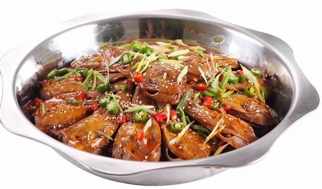 干鍋辣鴨頭是一道美味可口的名吃。傳香閣技術(shù)研發(fā)人員在川菜“干鍋菜”的基礎(chǔ)上,經(jīng)過長時(shí)間的實(shí)制、研究、改進(jìn)、創(chuàng)新、研制而成,改變了傳統(tǒng)的做法。辣鴨頭鍋?zhàn)佣松献罆r(shí),香氣四溢,滿屋飄香。一個鴨頭從下巴中間至腦門下刀一劈為二,腦髓及肉分割得恰到好處,然后被干辣椒、芝麻粒、花生粒簇?fù)碓诰妈F鍋里端上來,還未吃就已經(jīng)聞得出那股麻辣鮮香勁。