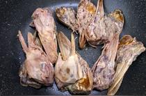 經(jīng)清洗后用沸水將鴨頭氽透,然后放入特制鹵水中鹵20分鐘至八成熟,用筷子往鴨頭扎時(shí)感覺稍硬即可撈出,切忌鹵得過火,否則在干鍋炒制過程中鴨頭宜脫骨變形。