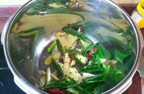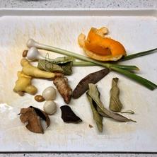 準(zhǔn)備好橙子皮,陳皮,沙姜,生姜,八角,蒜,桂皮,檸檬葉/香葉,大蒜苗。洗好切好。