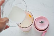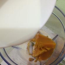 蒸熟的南瓜趁熱放入榨汁機杯中,加入500毫升純牛奶。