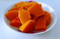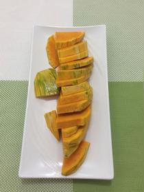南瓜清洗干凈,去皮去籽切成薄片,裝盤,放在鍋中蒸10分鐘即熟。生南瓜很硬,蒸熟之后變得非常柔軟,是因為里面還有可溶性膳食纖維,能夠促進腸胃蠕動,增加飽腹感。