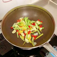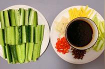 1、黃瓜大卸八塊; 2、芹菜、姜切條,蒜、朝天椒切片; 3、醬汁:6勺醬油、3勺醋、3勺蠔油、2勺糖,攪勻備用;
