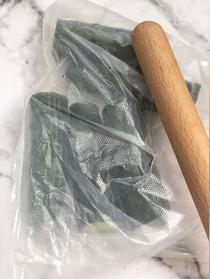 把黃瓜放在保鮮袋里面,再用搟面杖去拍它 這樣子拍黃瓜比較方便,最后黃瓜碎都在保鮮袋里