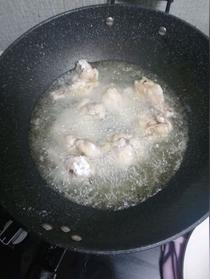 5.熱一鍋放入足以淹蓋雞腿的油,待油溫燒熱至160℃時,放入作法4的雞腿以中火炸約10分鐘后,撈出降溫。