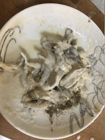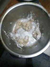蘑菇在干的生粉里打個滾抓勻放入2中裹上糊糊;