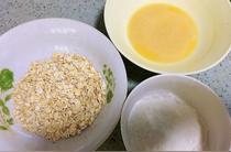 雞蛋敲入碗中打散,另取兩碗倒入麥片和淀粉。