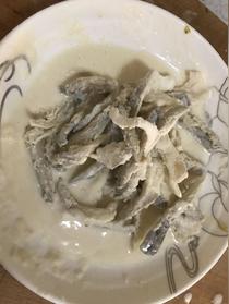 取出蒸好的雞腿,把料摘去,雞肉沾干淀粉