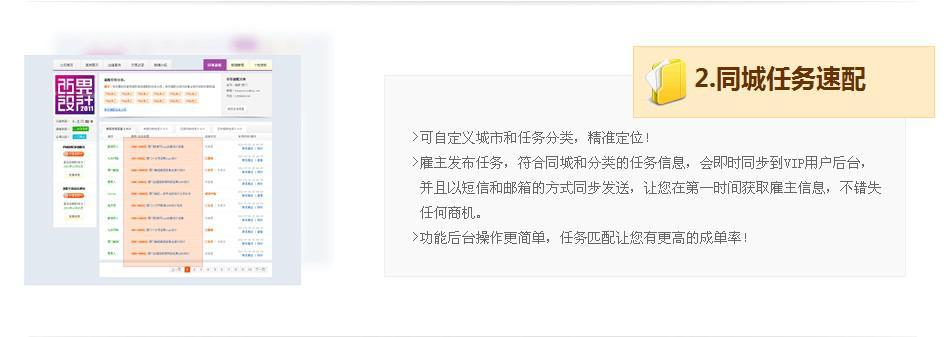 同城速配即 VIP會員可自由設(shè)置要定制的城市和分類,雇主一發(fā)布符合同城和分類的任務(wù)信息,即時會有手機(jī)短信、電子郵件和站內(nèi)信同步發(fā)送,在第一時間獲取雇主信息,不錯失任何良機(jī)。一品威客網(wǎng)負(fù)責(zé)人稱,一品VIP會員可享有同城速配服務(wù),這一增值服務(wù)走向市場后,受到專業(yè)創(chuàng)意公司、工作室和個人威客的歡迎。一品威客網(wǎng)堅持基礎(chǔ)業(yè)務(wù)不收費,增值業(yè)務(wù)收費的贏利模式,同城速配是一品威客網(wǎng)對威客平臺獲利模式的新探索。威客之父、中科院客座研究員劉鋒先生對此表示,一品威客網(wǎng)"同城速配"是個很好的創(chuàng)新。