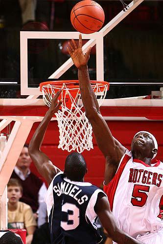 (2009-10賽季):場均蓋帽數(shù)在大東部聯(lián)盟排在第三位,單賽季145個(gè)蓋帽為羅格斯大學(xué)紀(jì)錄,28場比賽至少拿到3個(gè)蓋帽,57.9%的命中率排名聯(lián)盟第四,7.1籃板排在第四位。他整個(gè)賽季66次扣籃,在羅格斯大學(xué)排在首位,另外還有11記三分球。