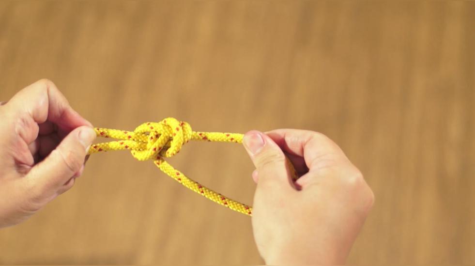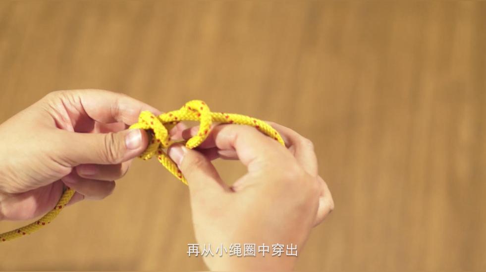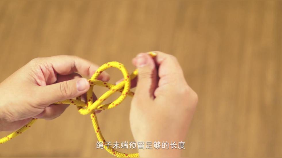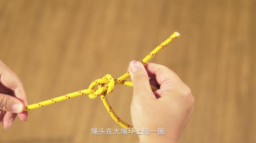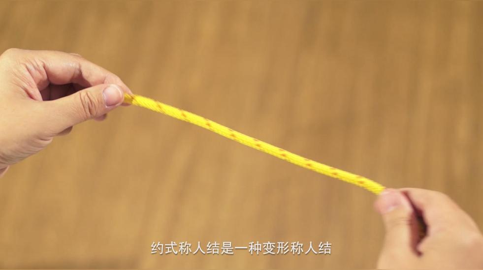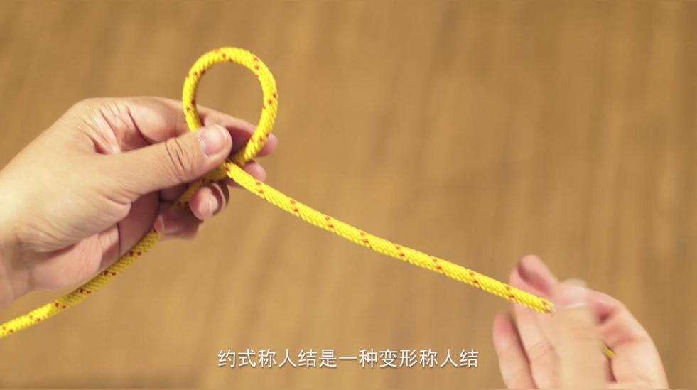 約式稱人結是一種變形稱人結,先打一個稱人結,繩子末端預留足夠的長度,繩頭在大繩環(huán)上繞一圈,再從小繩圈中穿出,調(diào)整拉緊。