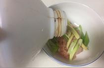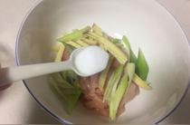蔥、姜、雞肉絲裝在一個(gè)碗里倒入料酒。 蔥,姜,料酒都是為了去腥氣的。