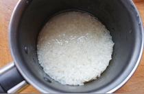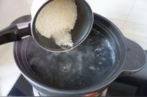 砂鍋燒開適量水,倒入投洗好的大米。