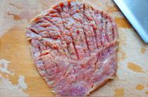 牛肉切成厚片,用刀背將肉質(zhì)敲松散。