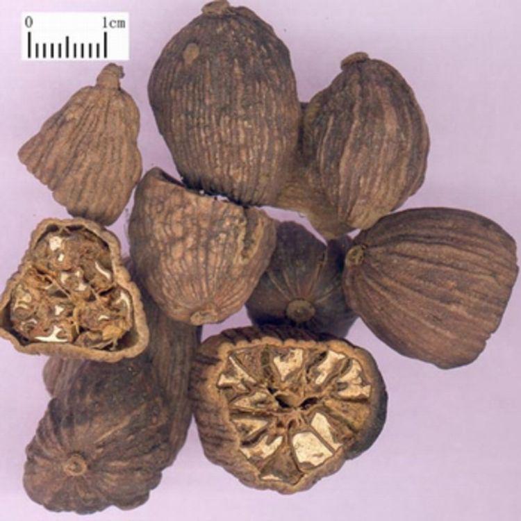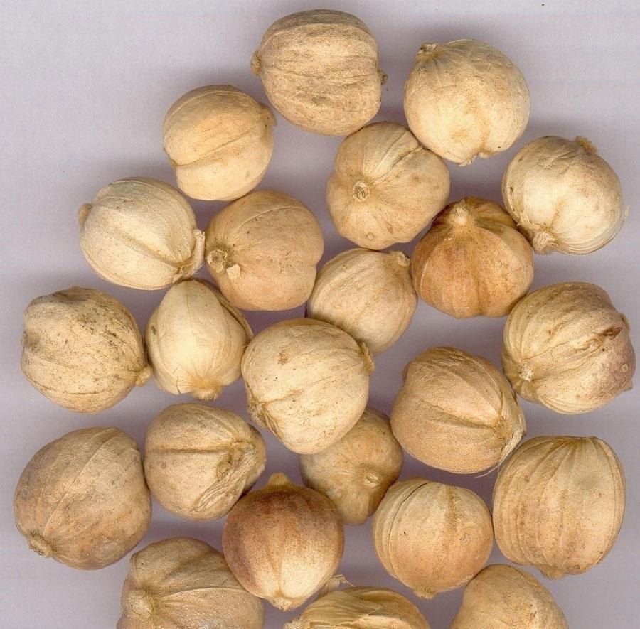 果實(shí)類球形,直徑0.8~1.2cm;表面黃白色至淡黃棕色,有3條較深的縱向槽紋,頂端有突起的柱基,基部有凹下的果柄痕,兩端均具有淺棕色絨毛。果皮易縱向裂開,內(nèi)分3室,每室含種子約10粒。種子呈不規(guī)則多面體,背面略隆起,直徑3~4mm,表面暗棕色,有皺紋。氣芳香,味辛涼略似樟腦。