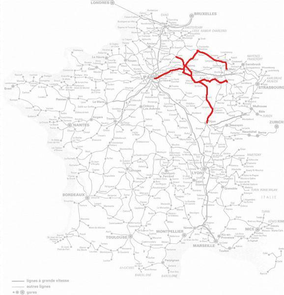 向南:跨過維勒河(La Vesle),前往埃佩爾奈(épernay)。在埃佩爾奈站連接原有的巴黎—斯特拉斯堡鐵路,并可換乘前往巴黎、香檳沙隆、巴勒迪克等方向的TER列車。復(fù)線電氣化鐵路,平均旅速超過100Km/h。2007年通過借用該線新建了前往香檳-阿登TGV站(Gare de Champagne Ardenne TGV)的支線鐵路,使蘭斯站開出的TGV列車能夠通過此通道進(jìn)入法國高速鐵路東線,直達(dá)巴黎。