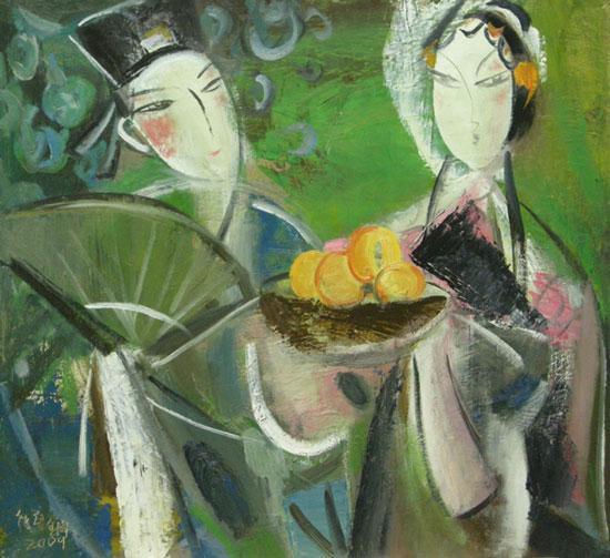從對(duì)中國(guó)瓷器的研究繼而轉(zhuǎn)向中國(guó)戲曲和民間版畫(huà),在唐勇鋼的筆下,侍女、戲曲人物更多的把人帶到 一種傳統(tǒng)的審美境界。同時(shí),在形、色方面又非常的概括和大膽,對(duì)現(xiàn)代派藝術(shù)風(fēng)格的使用得心應(yīng)手。觀唐勇鋼的繪畫(huà),他的繪畫(huà)題材和技法,讓人自然而然的想起:中國(guó)繪畫(huà)在內(nèi)憂外患、尋求發(fā)展的20世紀(jì)當(dāng)中不斷面對(duì)的“融合中西”、“油畫(huà)民族化”等諸多課題,而這些課題在當(dāng)下的語(yǔ)境當(dāng)中,已然失效,當(dāng)代文化情景當(dāng)中,中西已經(jīng)沒(méi)有絕對(duì)的對(duì)立和沖突,而媒材也已經(jīng)成為傳達(dá)思想和理念的載體,不再具備現(xiàn)代主義初期媒材本身意義的原發(fā)性。由此,再來(lái)看唐勇鋼的創(chuàng)作,更多的讓我們看到在全球化語(yǔ)境當(dāng)中,隨著經(jīng)濟(jì)和政治地位的提升,中國(guó)文化和民族自醒意識(shí)的增長(zhǎng)使藝術(shù)自然的逐漸超越了中西二元對(duì)立論。適應(yīng)潮流的發(fā)展