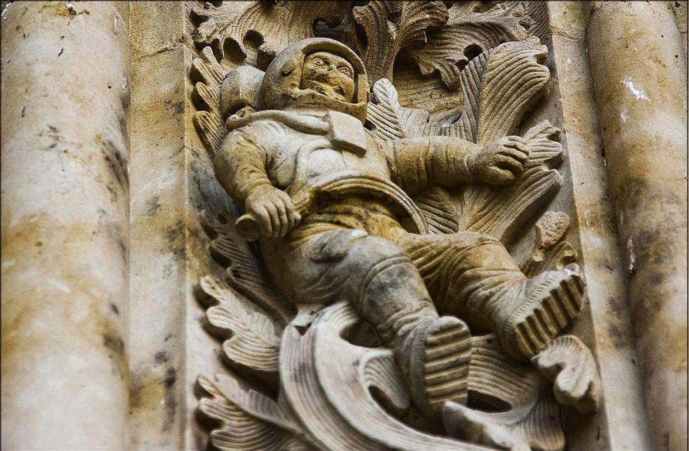 參觀薩拉曼卡大學(xué)的傳統(tǒng),就是在大樓的裝飾中尋找一只躲藏起來的小青蛙。有個(gè)傳說中講到,如果有學(xué)生能夠找到那只青蛙,那么他的考試就算通過了。從歷史角度上看,青蛙總是與壞習(xí)慣、不積極等缺點(diǎn)有關(guān)聯(lián)。試想對(duì)于游客們而言,那也是上了一堂道德課,讓人們來到這里從而認(rèn)識(shí)到哪里可以進(jìn)去哪里不行,什么才是生命中正確的道路,以及美德、事實(shí)和智慧等等真理。宇航員