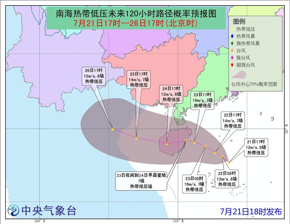 中央氣象臺:中央氣象臺于2017年7月21日18時發(fā)布熱帶低壓預(yù)報(bào)[1],7月22日18時發(fā)布臺風(fēng)藍(lán)色預(yù)警[2],7月25日18時解除臺風(fēng)藍(lán)色預(yù)警[3]