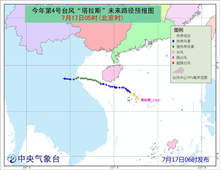 7月15日4時許,聯(lián)合臺風警報中心將其在24小時內(nèi)形成為熱帶氣旋的機會提升為“MEDIUM”。當日10時30分許,視其環(huán)流結(jié)構(gòu)不斷改善,聯(lián)合臺風警報中心將其在24小時內(nèi)形成為熱帶氣旋的機會提升為“HIGH”,并同步發(fā)出熱帶氣旋形成警報(TCFA)。當日15時許,日本氣象廳率先將其升格為熱帶風暴,給予其國際編號1704,并將其命名為塔拉斯,隨后香港天文臺將其升格為熱帶低氣壓。當日17時許,中央氣象臺亦將其升格為熱帶風暴[3]。此時“塔拉斯”主要采取西偏北方向移動,從海南島南側(cè)掠過,向越南北部一帶靠近。