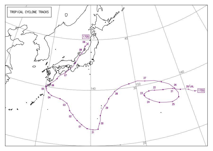 07月20日04時,聯(lián)合臺風警報中心對其在未來24小時內(nèi)形成為熱帶氣旋的機會提升為“MEDIUM”(中),繼而在13時升為“HIGH”(高),并同步發(fā)出熱帶氣旋形成警報。07月21日05時,聯(lián)合臺風警報中心將其升格為熱帶低壓,并給予編號07W。09時,日本氣象廳將其升格為熱帶風暴,給予國際編號1705,并命名為