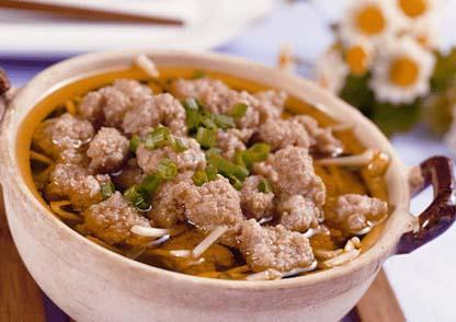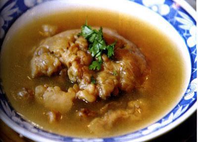 ⑷炒鍋上為,加雞湯500克,放入蔥段、姜塊及肉片,加入鹽、料酒,開鍋后用小火燒制,待肉酥爛時(shí),加入香菜末、蔥絲、姜絲、胡椒面、味精、醋淋少許香油,即可盛裝在湯碗中。