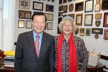 2012年,美國李昌鈺刑偵學(xué)院世界首席刑偵大師、李昌鈺刑偵學(xué)院院長李昌鈺博士親切會見了福建海天書畫代表團(tuán),對江愛松先生的現(xiàn)代國畫作品給予了高度的評價,李昌鈺院長收藏江愛松作品《瀟瀟雨歇》