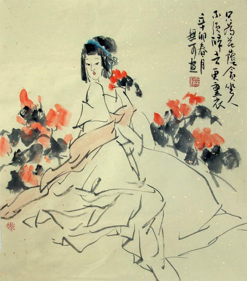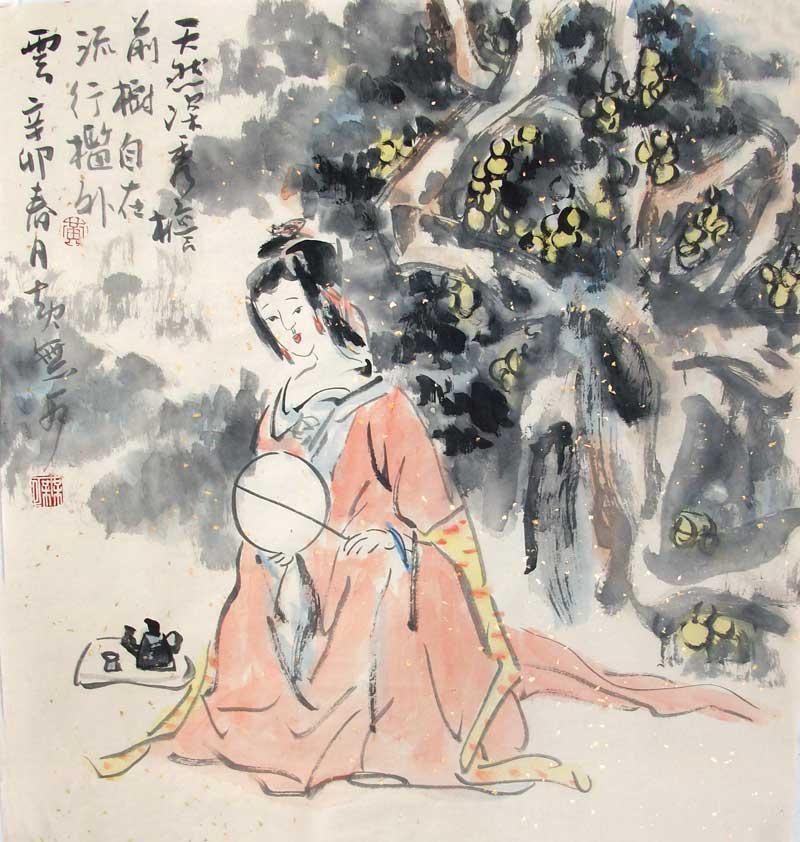 唐代畫(huà)家學(xué)者張彥遠(yuǎn)在《歷代名畫(huà)記》里,將畫(huà)作與畫(huà)家分為上古下古多個(gè)時(shí)代,他說(shuō)“上古之畫(huà),跡簡(jiǎn)意淡而雅正,顧陸之流是也;中古之畫(huà),細(xì)密精致而臻麗,展鄭之流是也;近代之畫(huà),煥爛而求備”,意思是說(shuō)每個(gè)時(shí)代崇尚的畫(huà)風(fēng)并不相同,畫(huà)家也具有鮮明的時(shí)代風(fēng)格,張彥遠(yuǎn)生出相門(mén),藝術(shù)造詣極深,看得亦遠(yuǎn),此處他非厚古薄今,實(shí)亦批判當(dāng)時(shí)之浮躁畫(huà)風(fēng),很難說(shuō)出上古之畫(huà)與中古之畫(huà)以及當(dāng)世之畫(huà)的區(qū)別,名畫(huà)自有其出名之處,名家亦自有其得名之因。若當(dāng)今之為畫(huà)者能汲取上古之跡簡(jiǎn)意淡之神,融匯中古之細(xì)密精致之韻,加之天賦與勤勉,則為名家大家又何難?無(wú)可先生,常觀古人之畫(huà),每在全國(guó)各地展覽館、美術(shù)館,遇歷代名畫(huà)佳作,便廢寢忘食流連終日于畫(huà)前,含英咀華,深刻體悟,神接千載,意會(huì)古賢。其實(shí),無(wú)論畫(huà)家書(shū)家或?qū)W者詩(shī)人,悟性乃天資之首因,悟性高則天資深,無(wú)可先生勤奮而敏銳,畫(huà)作古之大家畫(huà)風(fēng)實(shí)屬正常,正所謂水到而渠成也。無(wú)可先生曾贈(zèng)我一幅仕女圖,這是我問(wèn)他特意索取的一幅畫(huà),因?yàn)槲覀兌枷矚g明代才子唐寅。唐寅善畫(huà)仕女是天下皆知的,無(wú)可先生少年即以唐伯虎之仕女為范本,仔細(xì)精研,博采眾長(zhǎng),綜合唐代仕女圖之畫(huà)風(fēng),故得今日之境界。