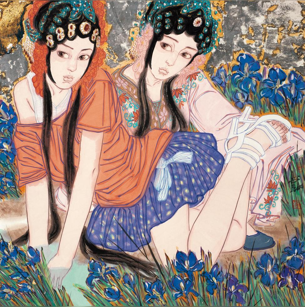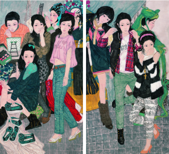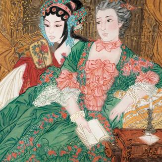 許瑩以令人驚艷的繽紛彩墨描繪的年輕中國女性是聯(lián)系過去、現(xiàn)在與未來的主角。她們有小巧的臉孔和大大的眼睛,不僅是作者的藝術暗號,也像是漫畫或海報中的角色。她們漂亮、恰如其分的優(yōu)雅,有吸引力但不魅惑,即使在某些佛教的場景前,這些穿著時髦洋范,或代表某種現(xiàn)代潮流的女孩們,卻也流泄出略具諷刺意味的惆悵。