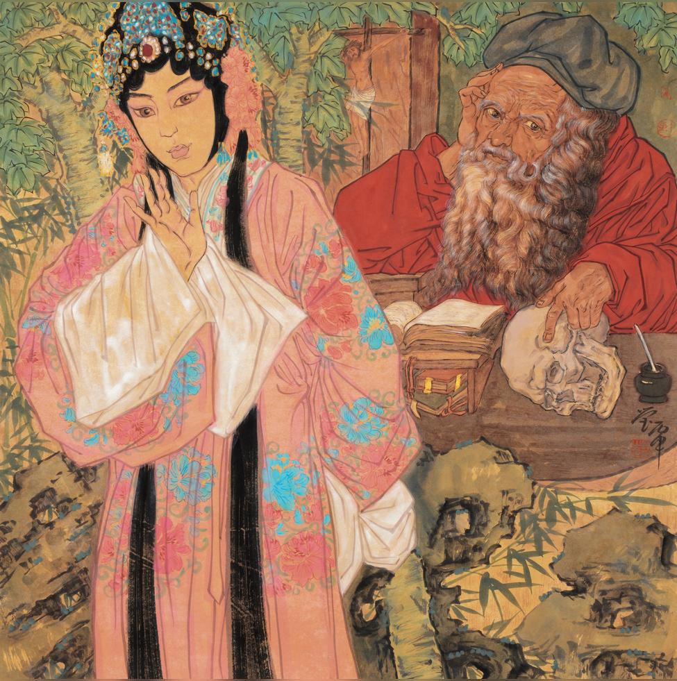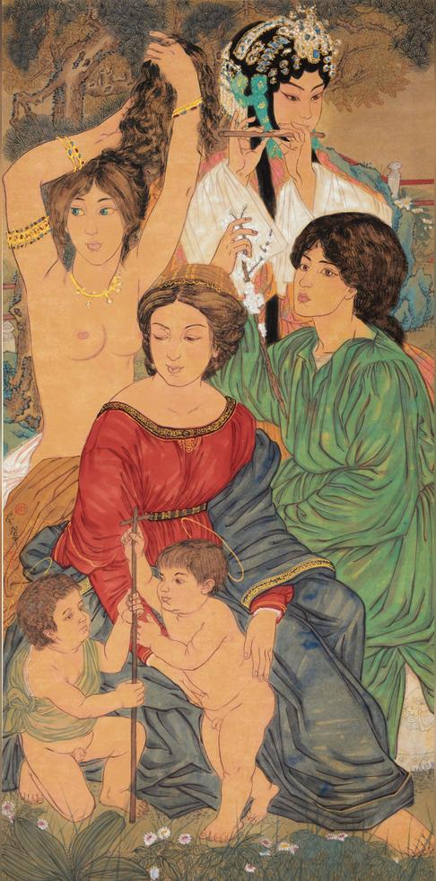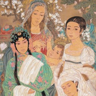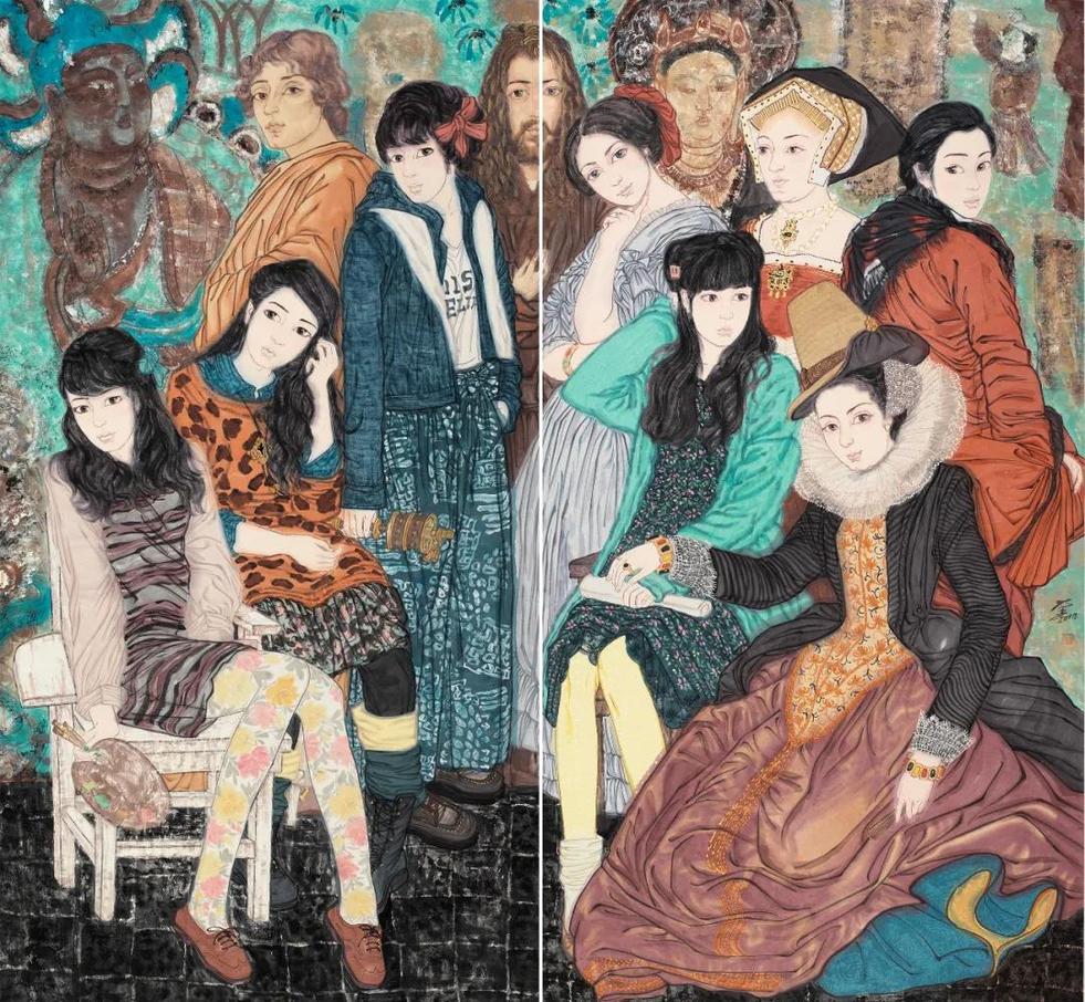 在她的其他作品中,諸如波提切利、達芬奇、杜勒和霍爾拜因等藝術大師在西方藝術史上留下令人難忘的杰作片段也交叉錯縱的呈現(xiàn)。幾乎都是面孔或胸像,從其原始環(huán)境〔也就是我們所熟悉的藝術文化背景〕中裁剪下來,置入一個宏觀的構圖(通常是近2米見方的大尺寸畫面),將這些元素以一種流暢的手法融入一種嶄新的—色彩繽紛并且相當寫實—中國意境之中。