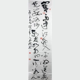 他行草書寫似行云流水,筆畫與筆畫之間的連接,尤顯動感,結(jié)構(gòu)謹(jǐn)嚴(yán),上大下小,上重下輕,而大小輕重又不失宜,如危巖欲墜而不墜。有“蓋世”之氣,大王之風(fēng)。并可觀到:不管是小幅斗方還是數(shù)米長卷都是一氣呵成,其作品上下互連,斜借正,正借斜,俯借仰,相互借勢,都是那么的恰到好處。