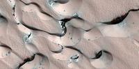 此沉積層截面還反映了與眾不同的沙層和滿是塵埃的冰層。這種層次交錯(cuò)的地形特征出現(xiàn)在此沙層之中,表明其每一層來(lái)源于一個(gè)沙丘,而此沙丘隨后被冰覆蓋了。不過(guò),此圖片上的顏色不同于正常人類視力所看到的自然色彩,而是一種強(qiáng)化色彩,以更好區(qū)分火星表面上的冰霜、塵埃和巖石。