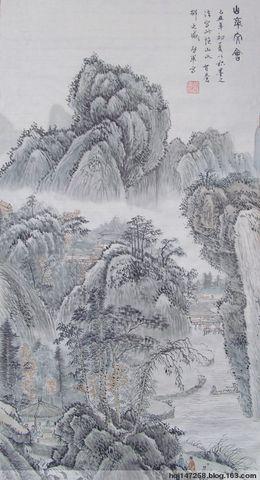 積墨應(yīng) 先用淡墨后用濃墨,多次積疊,或用干筆皴擦后用濕筆層加,所謂“由干入潤(rùn),由潤(rùn)入干”,反復(fù)交替進(jìn)行。積墨作畫是繪畫的一道難關(guān),弄不好,臟,死,板,膩一塌糊涂。這種畫法易傳山水渾厚蒼茫之氣,畫面耐看,但很難于掌握??傊莆蘸孟雀珊鬂竦哪疽?guī)律。對(duì)不同的濃淡層次,有的以濕筆為主,有的則以干筆為主。