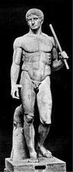 古典Contrapost從西方雕塑早期便出現(xiàn)了。從古希臘雕刻家波利克里托斯Polykleitos(約公元前4世紀(jì))的作品中可以看出,Contrapost是其作品以及其后繼者如利希普斯Lysippos, 斯科帕斯Skopas等雕塑家作品中的特征之一。Polykleitos式的雕像如 Discophoros和Doryphoros,理想化的運(yùn)動(dòng)健將般的青年男子以Contrapost的姿態(tài)顯現(xiàn)出神一般氣質(zhì)。在這些作品中,骨盆不再與直立的雕像在同一中心。