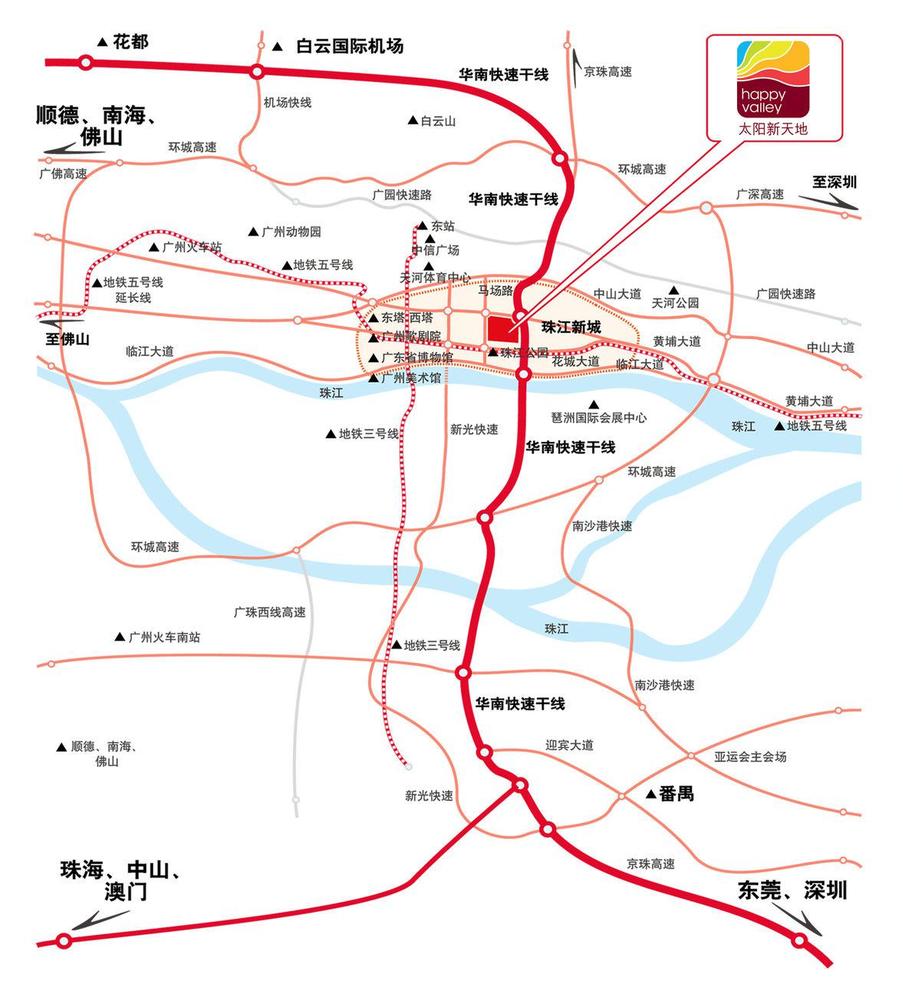 太陽新天地購物中心位于馬場(chǎng)路,珠江新城東部的核心區(qū),緊靠廣州馬場(chǎng)美食城及珠江公園,交通便利,緊鄰地鐵五號(hào)線和華南快線,頃刻間到達(dá)天河、番禺、東圃、東部經(jīng)濟(jì)開發(fā)區(qū)、科學(xué)城等地,覆蓋該地區(qū)的高端消費(fèi)人群。此外還可通過華南快速干線與廣深高速、廣佛高速、新光快線、南沙港快線等連接,短時(shí)間可達(dá)佛山、東莞、南海、順德及中山等地,快速接駁珠三角“1小時(shí)城際生活圈”。